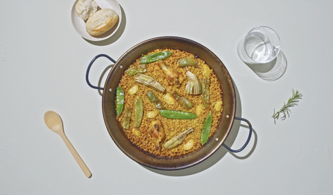 Pour the rice and distribute it evenly throughout the paella. Do not stir it during the rest of the process.